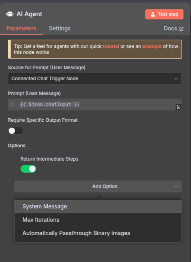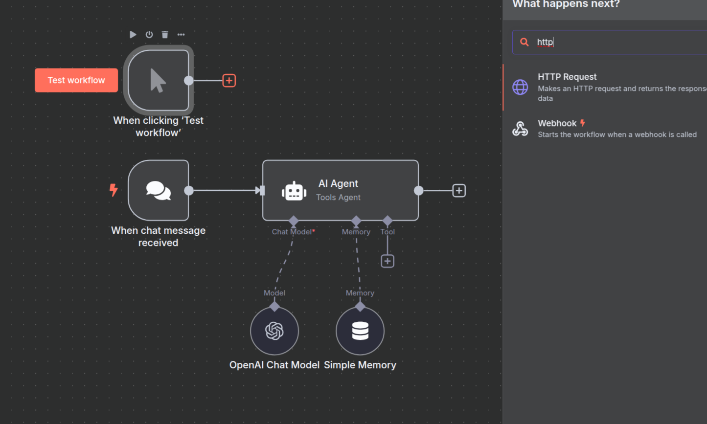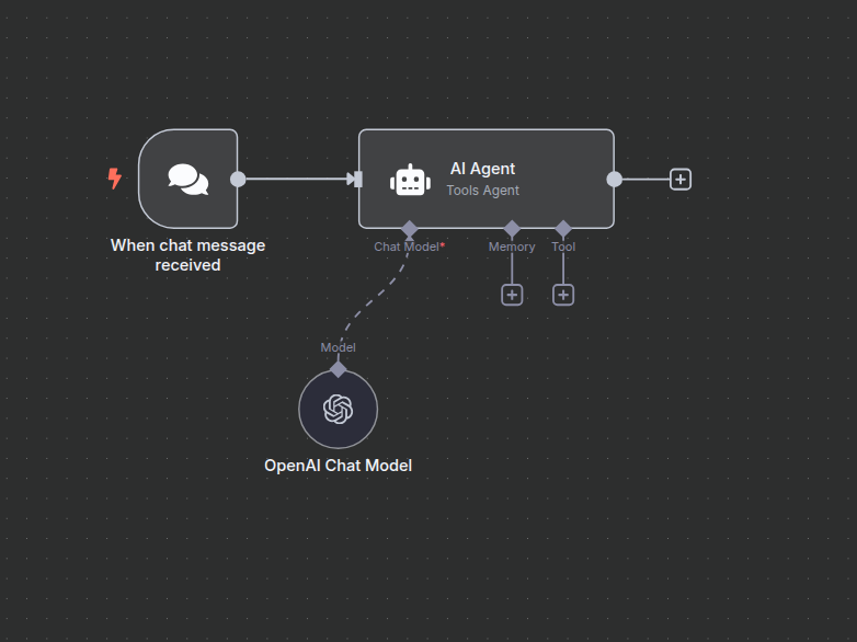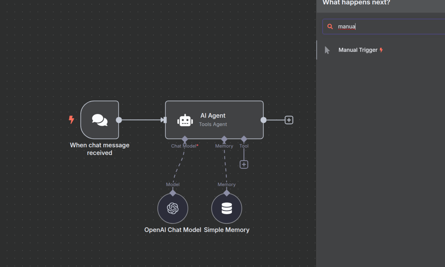 Click the + icon on the first connector of the AI Agent node to open the connection menu.