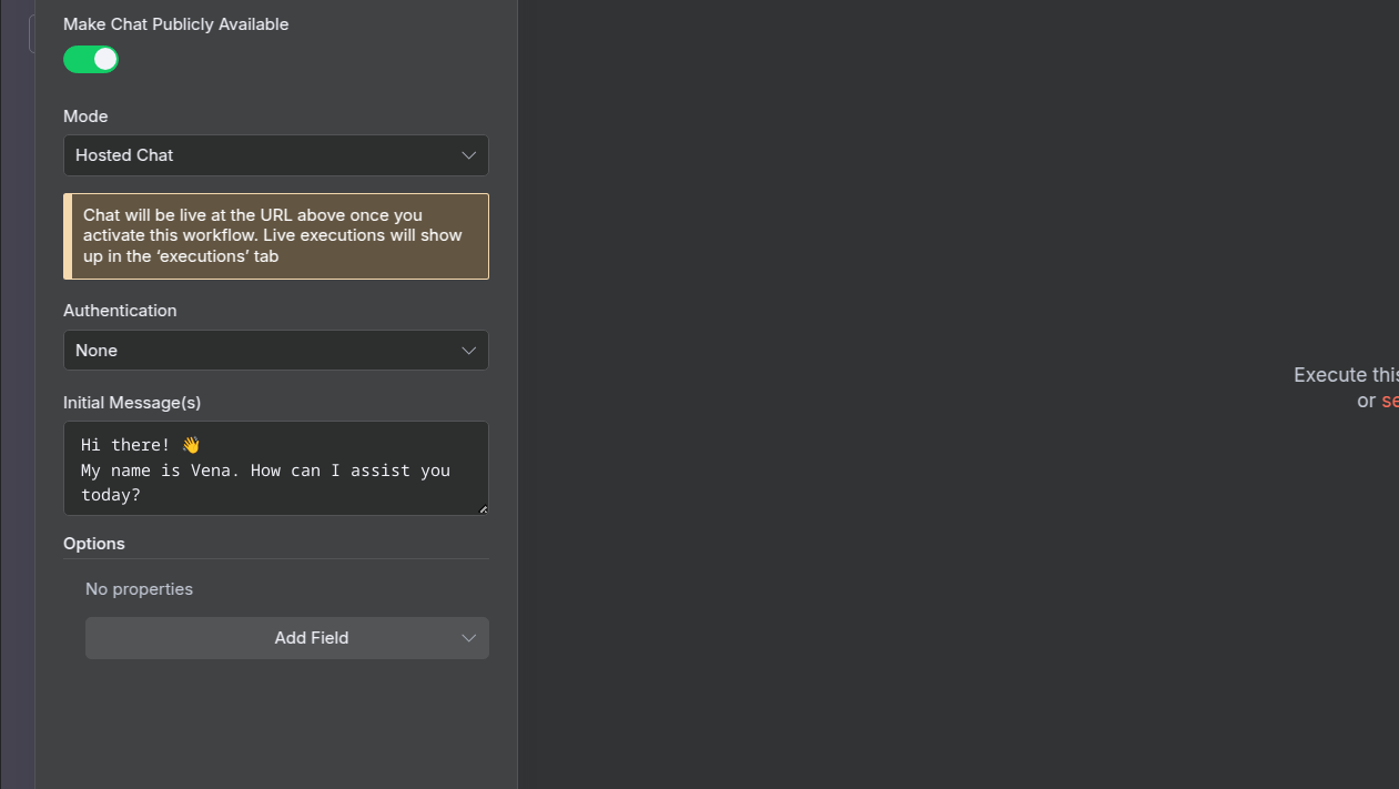 With the first node (Chat Trigger) selected, find the Initial Message field in the configuration panel.