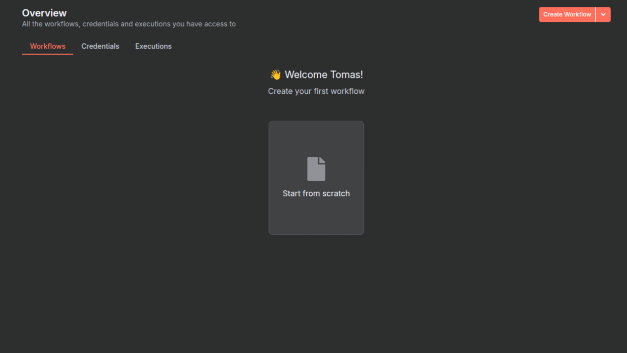 Once logged into n8n, navigate to the workflow editor in your n8n cloud instance. Click on the "Create New Workflow" button to start building your automation. To create a new workflow from the beginning, click on the "Start from scratch" button.