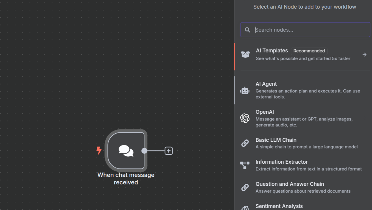 For the first node in your workflow, you need to set a trigger. In this scenario, use the Chat Trigger.