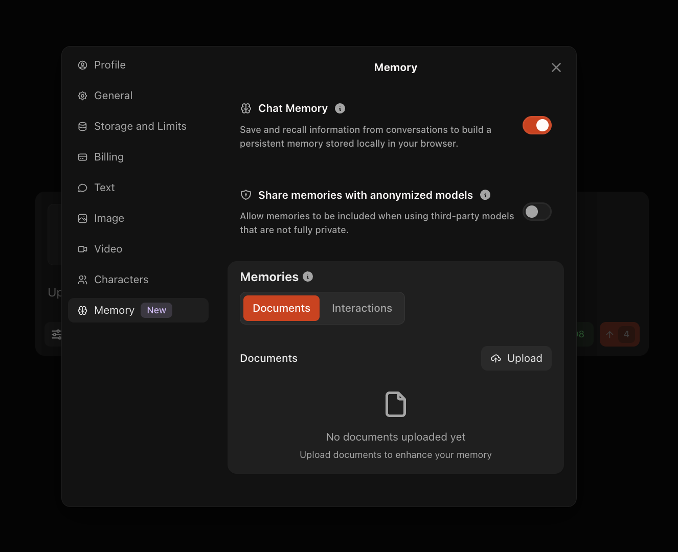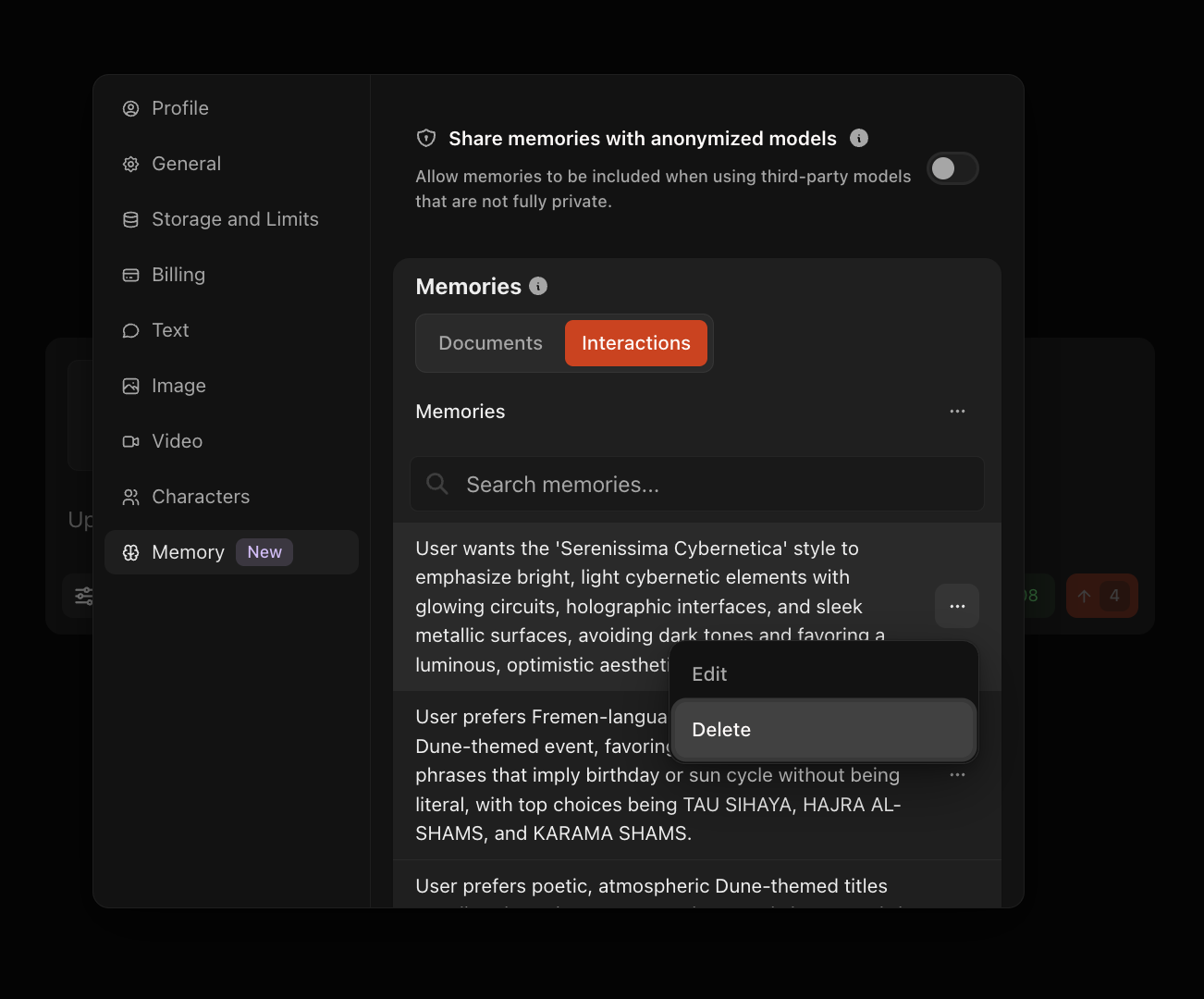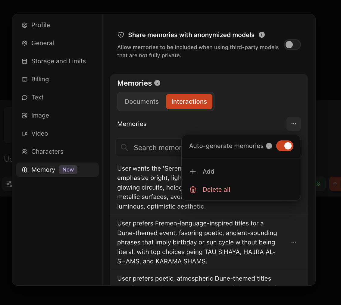 - If enabled: The "Share memories with anonymized models" toggle allows memory context to be sent