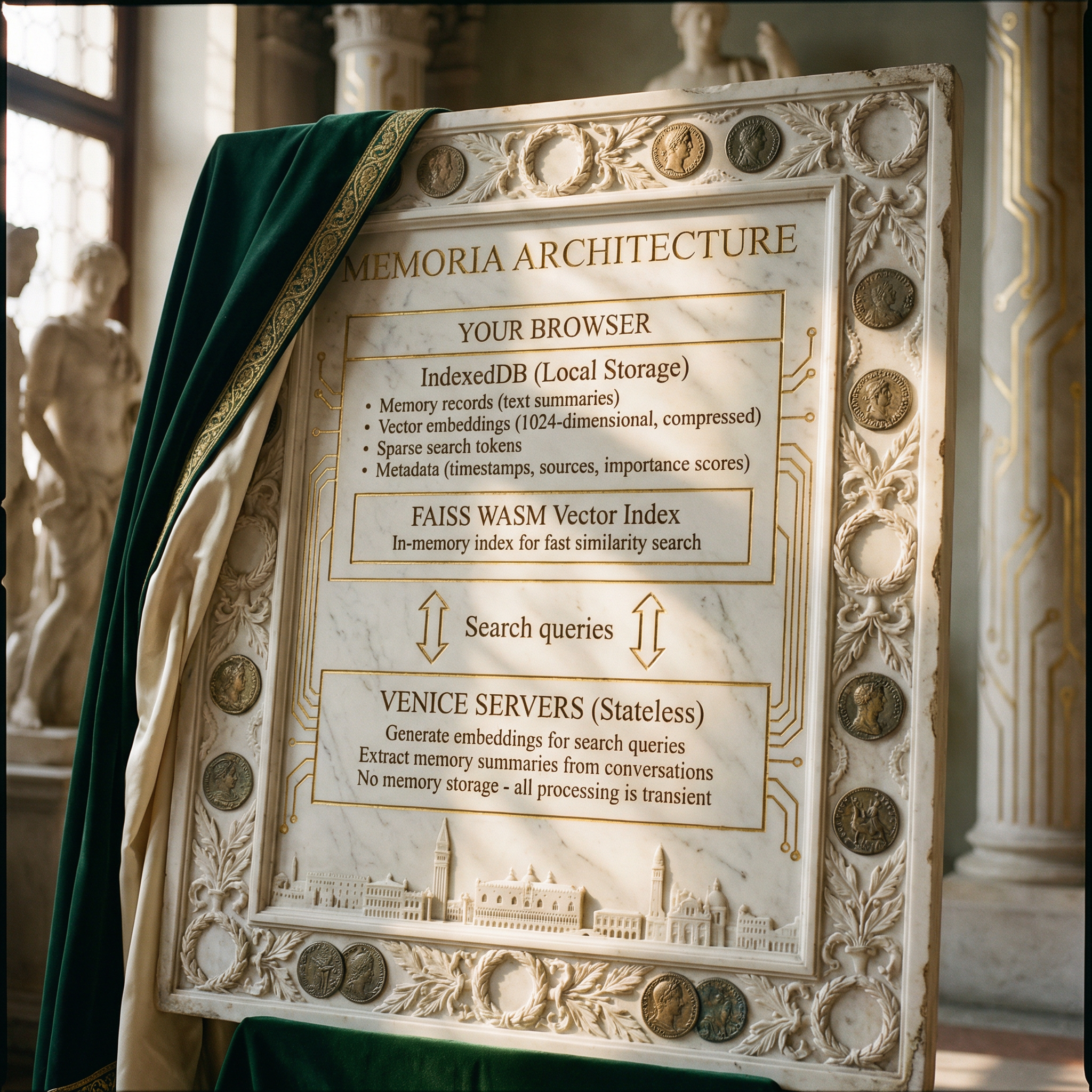 Memoria uses vector embeddings to understand and retrieve relevant memories. When you chat with Venice: